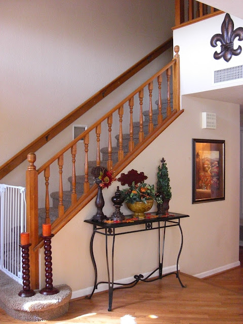 Here is my entry way table, a few posts back I showed you this Tuscan pot that I got from Big Lots and I decided to fill it with some greenery and then just add some leaves, pumpkins and gourds for a touch of fall. I added a fall flower pick from Hobby Lobby to the candlestick and instead of putting a candle on top I place a grapevine pumpkin.
